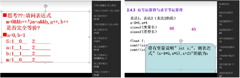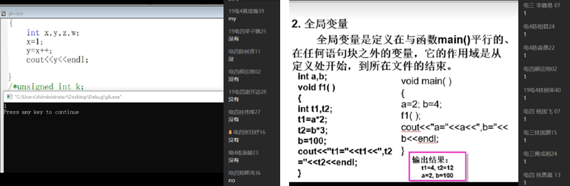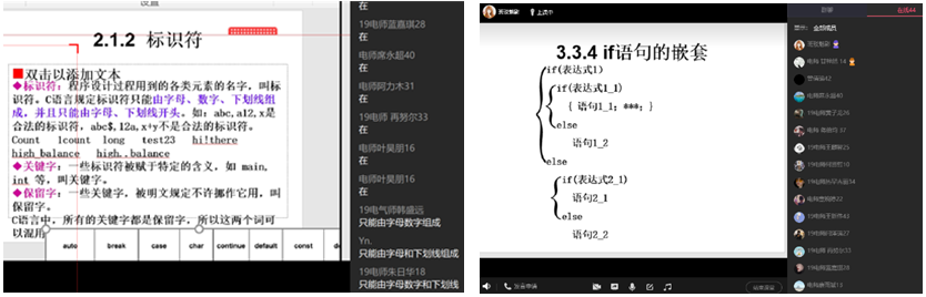 根据《C语言程序设计》课程知识点的特征,理论学习相对枯燥,宜采用“案例+实践”教学模式。疫情下,课堂实践受到很大程度的约束,为保证员工对知识点的深刻理解和应用能力,课程采用“线上网络主播式案例课堂”+“线下实践24小时答疑”进行授课。“线上网络主播式案例课堂”,是以网络主播模式在QQ群课堂平台下进行授课,实现全员互动,增强课堂吸引力。课堂场景设计分享如下: