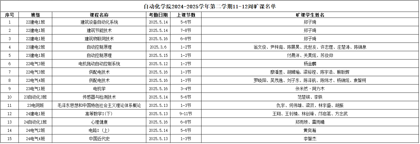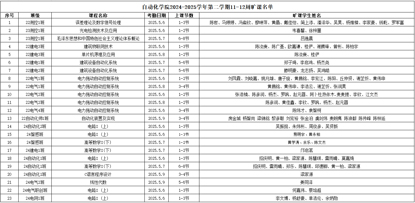 现将云顶国际8588yd(中国)有限公司2024-2025学年第二学期11-12周课堂缺勤情况公示如下: