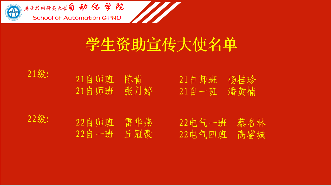 会上,马一然指出资助政策宣传的重要性,强调了选拔和培养资助宣传大使的意义,对各位候选人表示了肯定与支持。同时,为陈青、张月婷、杨桂珍、潘黄楠、雷华燕、丘冠豪、蔡名林、高睿城八位同学颁发员工资助宣传大使聘书,并提出将资助政策宣传带回家乡宣传到位的工作要求。