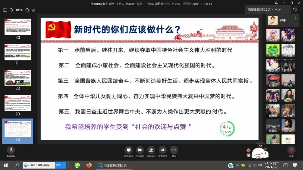 为加强党支部全体党员和入党积极分子们对中国共产党发展历程的认识和了解,2021年6月8日晚上20:30,测控与建电专业员工党支部挂钩党委委员祁伟老师通过线上直播授课方式,以“学史明理,学史力行”为主题,为测控与建电专业员工党支部全体党员和入党积极分子们上了一堂深刻而有意义的党课。