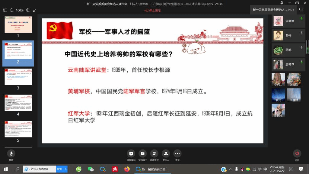 会议伊始,测控教工党支部书记唐德翠老师通过设置问题“大家知道我国近代史上著名的军事院校有哪些”为党课拉开序幕,祁伟教授回答黄埔军校、蒋鹏副书记回答云南陆军军官公司,党课在讨论和思考中徐徐展开。唐书记首先分享了她近期看到的凤凰卫视纪录片《军校育英才》的主要内容,然后为大家图文并茂讲解中国近代史上培养将帅的军校:云南陆军讲武堂、黄埔军校、红军大学。从各个军校的成立时间、培养人才特点及理念等角度一一展开,讲到云南陆军讲武堂这所最早的军校熔炉时,还给大家讲解了朱德元帅为了求学而将朱建德改名为朱德的小故事。重点讲解了黄埔军校和红军大学根据时局对人才需求来制定招生政策、授课内容和授课方式,从根本上回答了为谁培养人、培养什么人和如何培养人的三个问题。