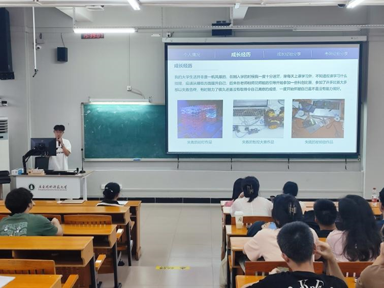 2024届优秀毕业生党员翁家鑫则结合个人成长经历和科创、考研等经验重点分享就业、升学的规划。作为24年国家奖学金获得者、广师大之星“十佳创新标兵”荣誉称号获得者、3次科创比赛国奖获得者、3项专利发明人的翁家鑫,更是以385分的好成绩,顺利被心仪的厦门大学机器人专业录取。翁家鑫以其亲身经历为师弟师妹们分享了许多宝贵的成长经验,鼓励师弟师妹们的敢于追梦逐梦、敢于拼搏奋斗。