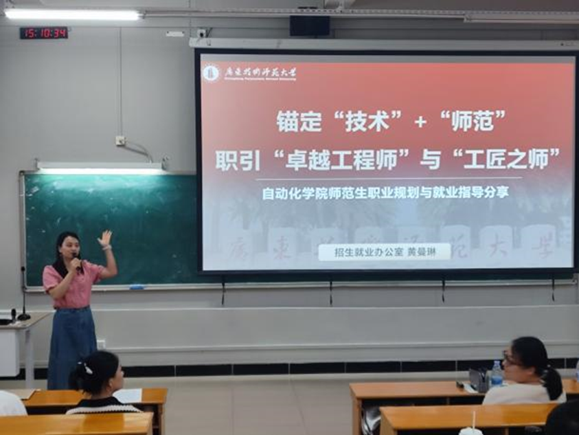 分享会伊始,黄曼琳老师紧扣公司“技术+师范”的办学定位,重点解读了电气专业和自动化专业职教团队的培养方向,并结合国家政策和专业特点,深入浅出地分析了当前的就业方向和前景,为同学们制定职业目标指明了方向。最后扩展到职业技能的具体培养路径,为同学们上了生动的一堂分享课。